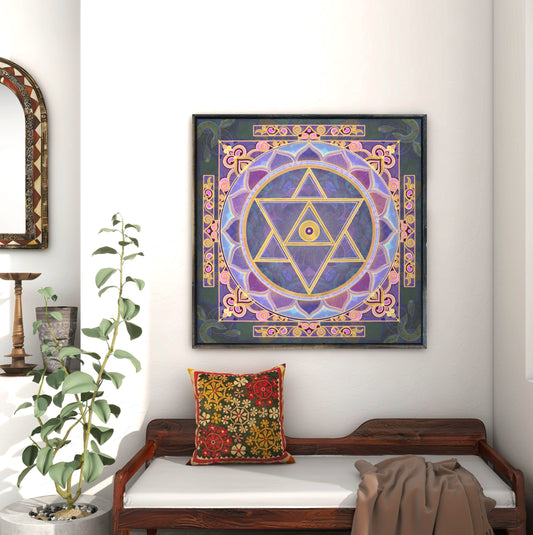 This artwork shows Hanuman flying through the sky, carrying an entire mountain to save Lakshman’s life. Behind him, the clouds and mountains stand still, as if watching something divine unfold.It’s a moment full of faith, love, and purpose!
