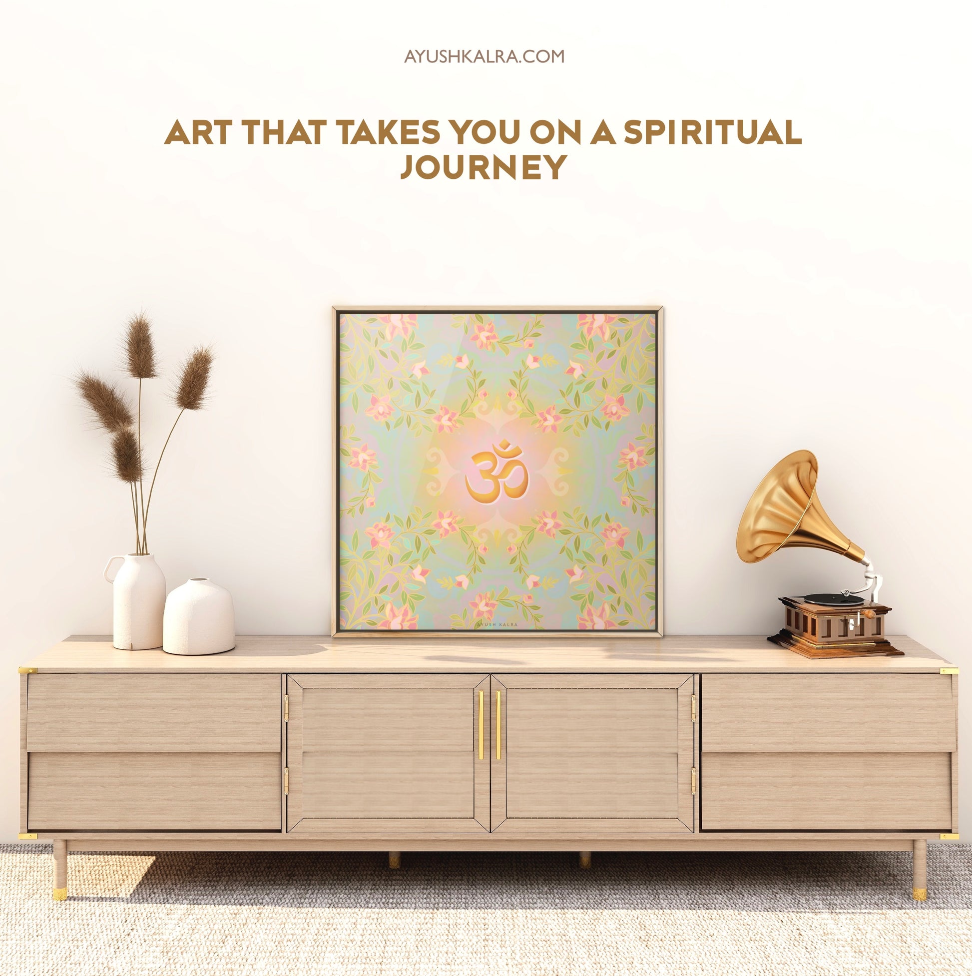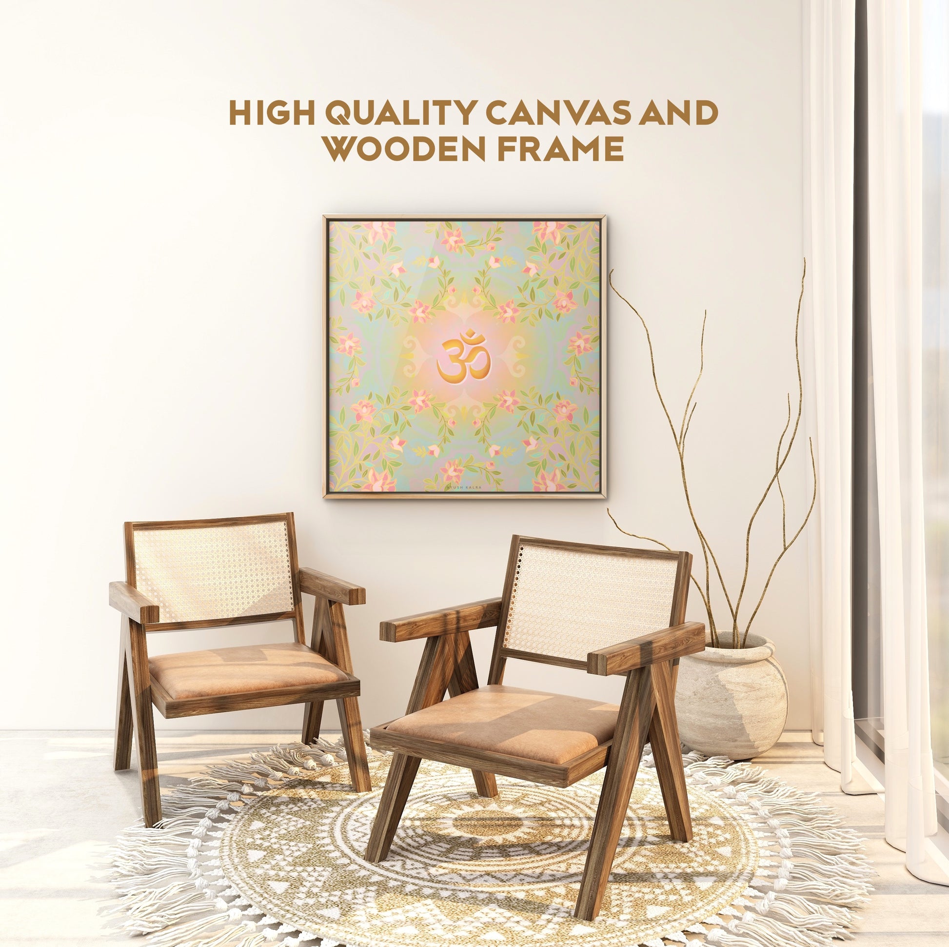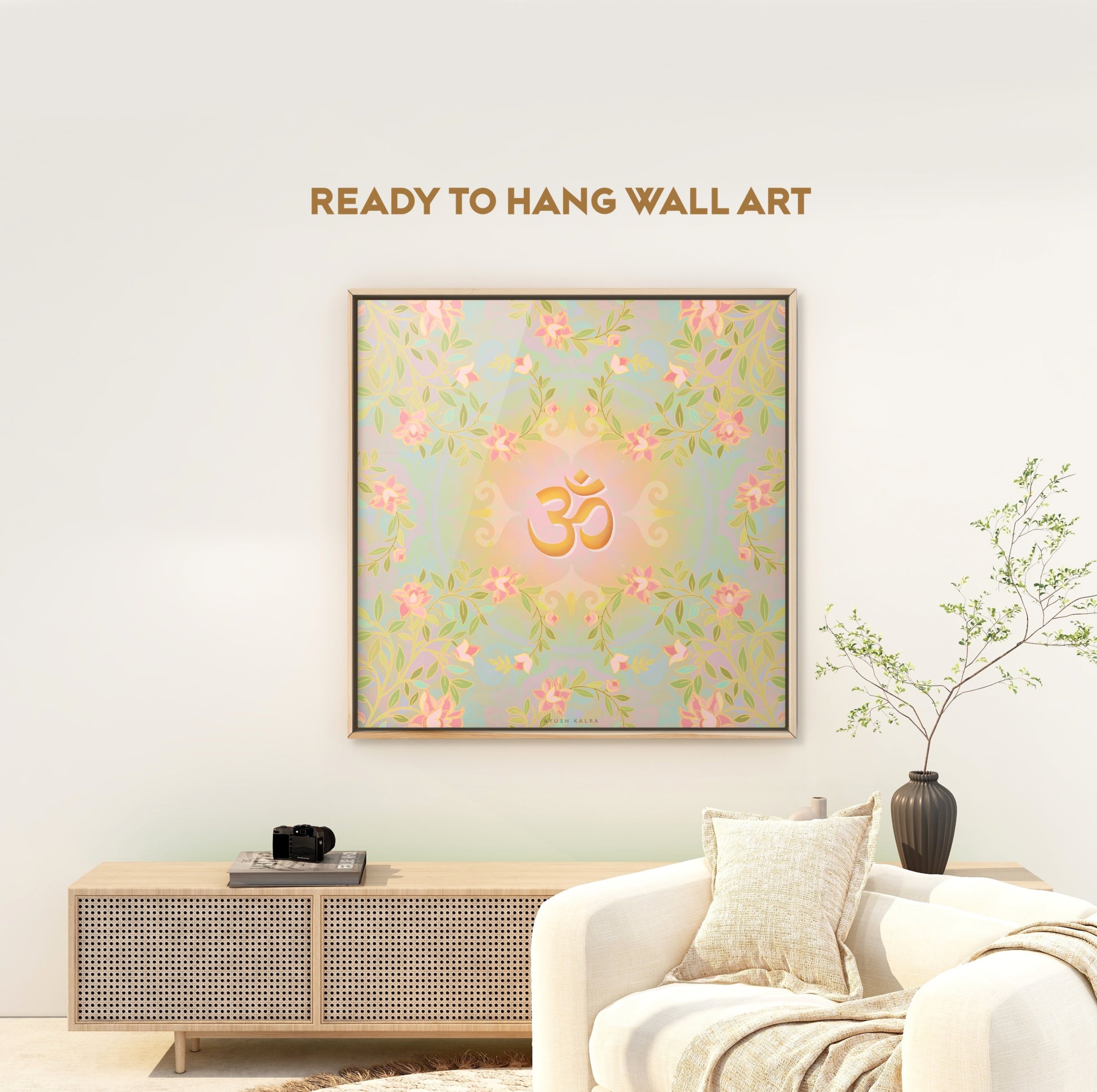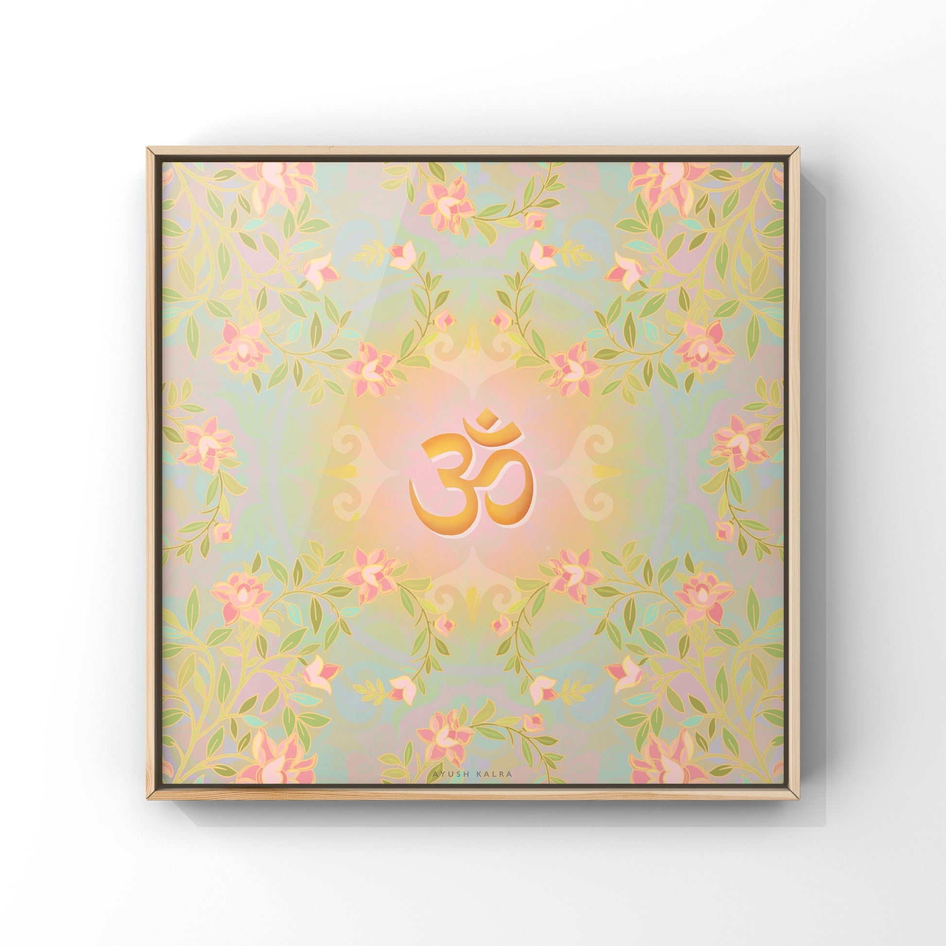 This artwork beautifully blends the sacred symbol Om with the delicate elegance of blooming flowers, creating a serene visualthat radiates peace, mindfulness, and natural beauty. Perfect for meditation spaces, yoga studios, or any corner of your hom seeking calm and inspiration. Let this piece be a gentle reminder of inner balance and the timeless connection between thespiritual and the natural world.