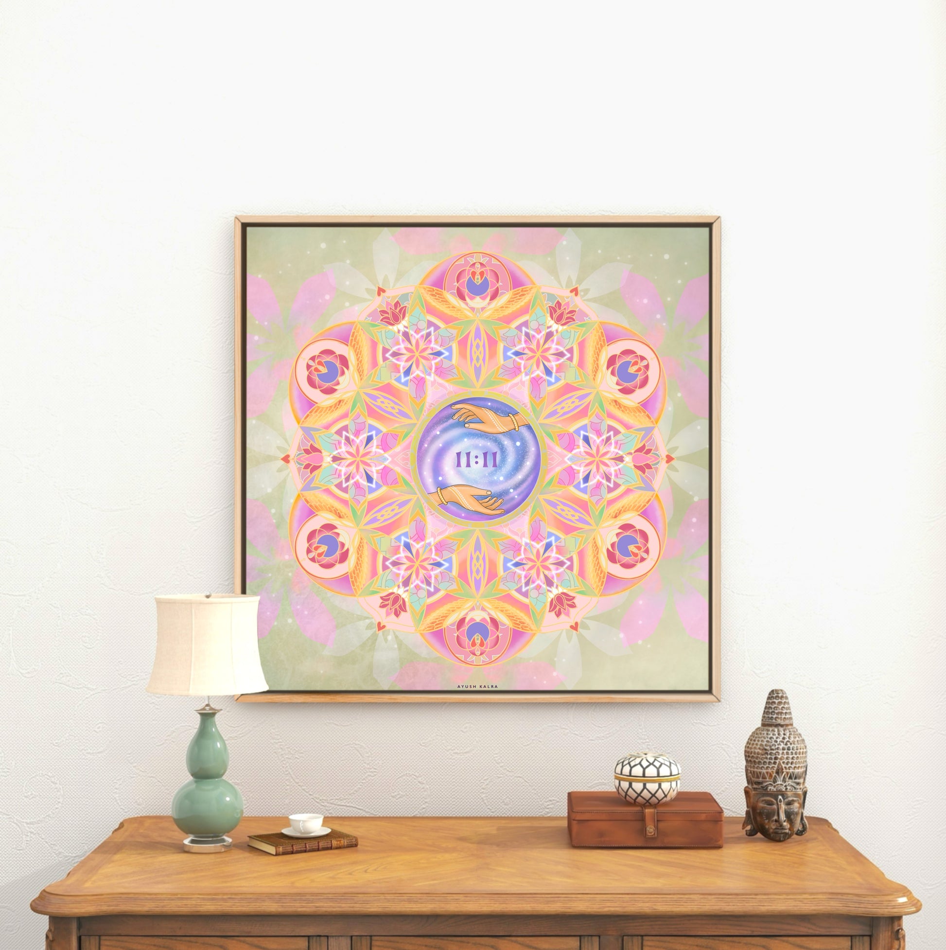 A mystical piece featuring the sacred number 11:11 at its center, a universal symbol of synchronicity, divine blessings, and manifestation. This artwork serves as a daily reminder to align your thoughts with your higher purpose.