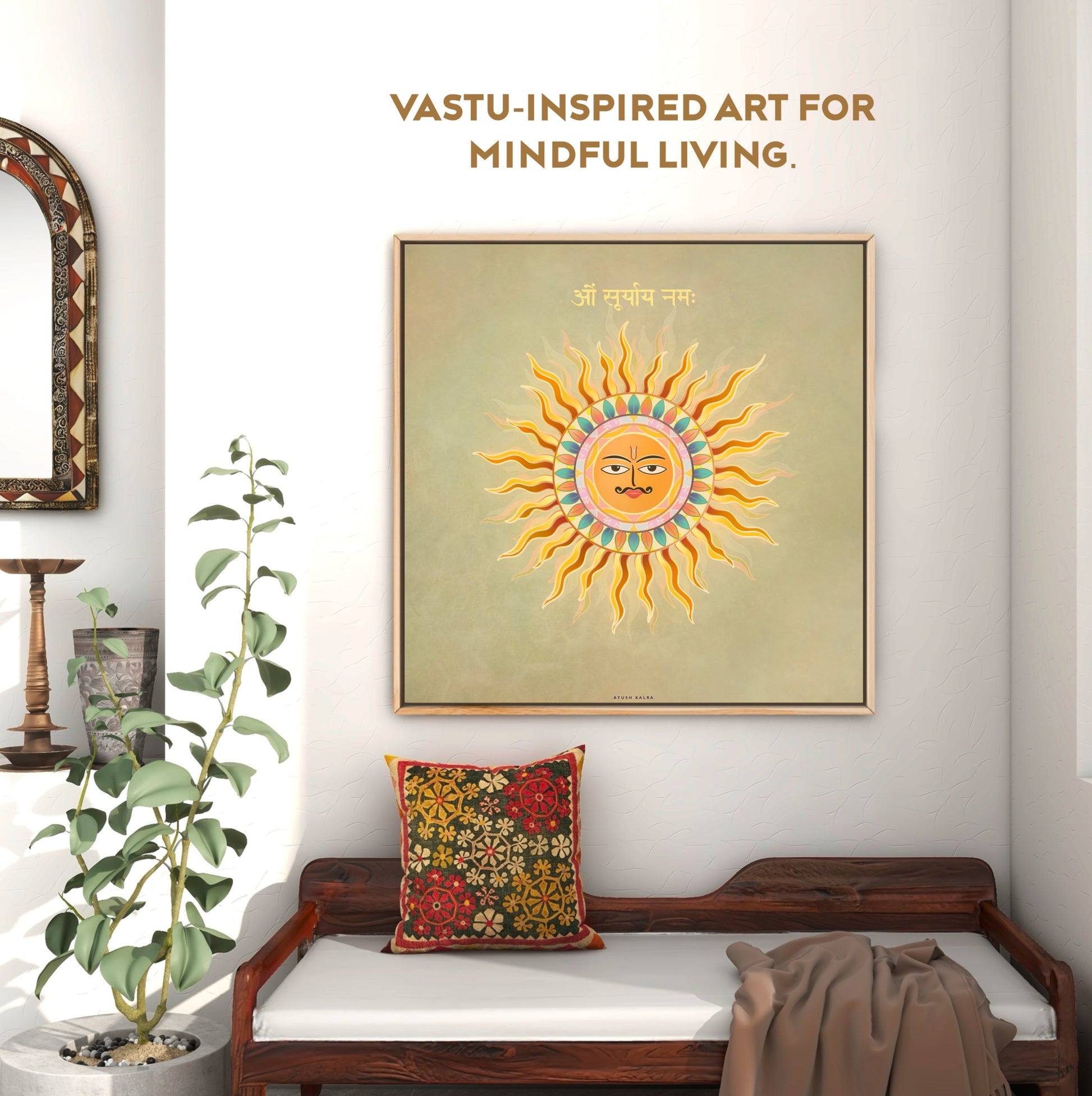 A radiant artwork of the Sun with the mantra “Om Surya Namaha” inscribed on top. It represents vitality, success, and divine light, infusing your space with positivity and strength.