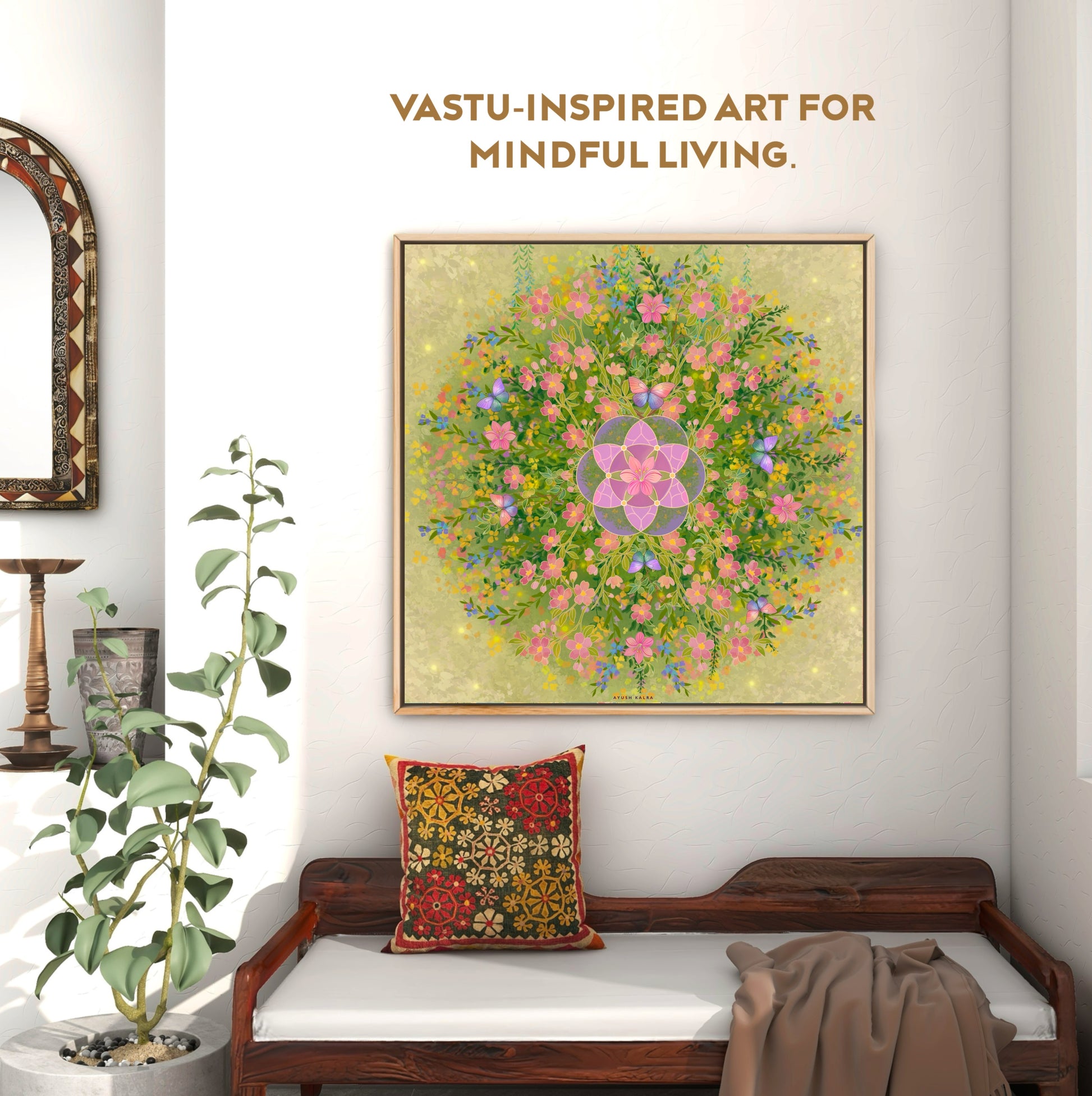 An enchanting mandala of flowers interwoven with butterflies and natural elements. This artwork represents harmony, the cycle of life, and the gentle beauty of nature. It brings positivity and a refreshing aura into your living space.