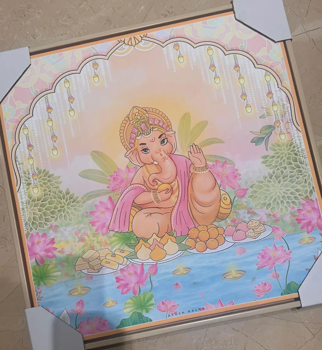 Lord Ganesha, the remover of obstacles, sits in divine grace with his beloved sweets, symbolizing joy, wisdom, and abundance. His presence radiates peace, prosperity, and endless blessings in every space.