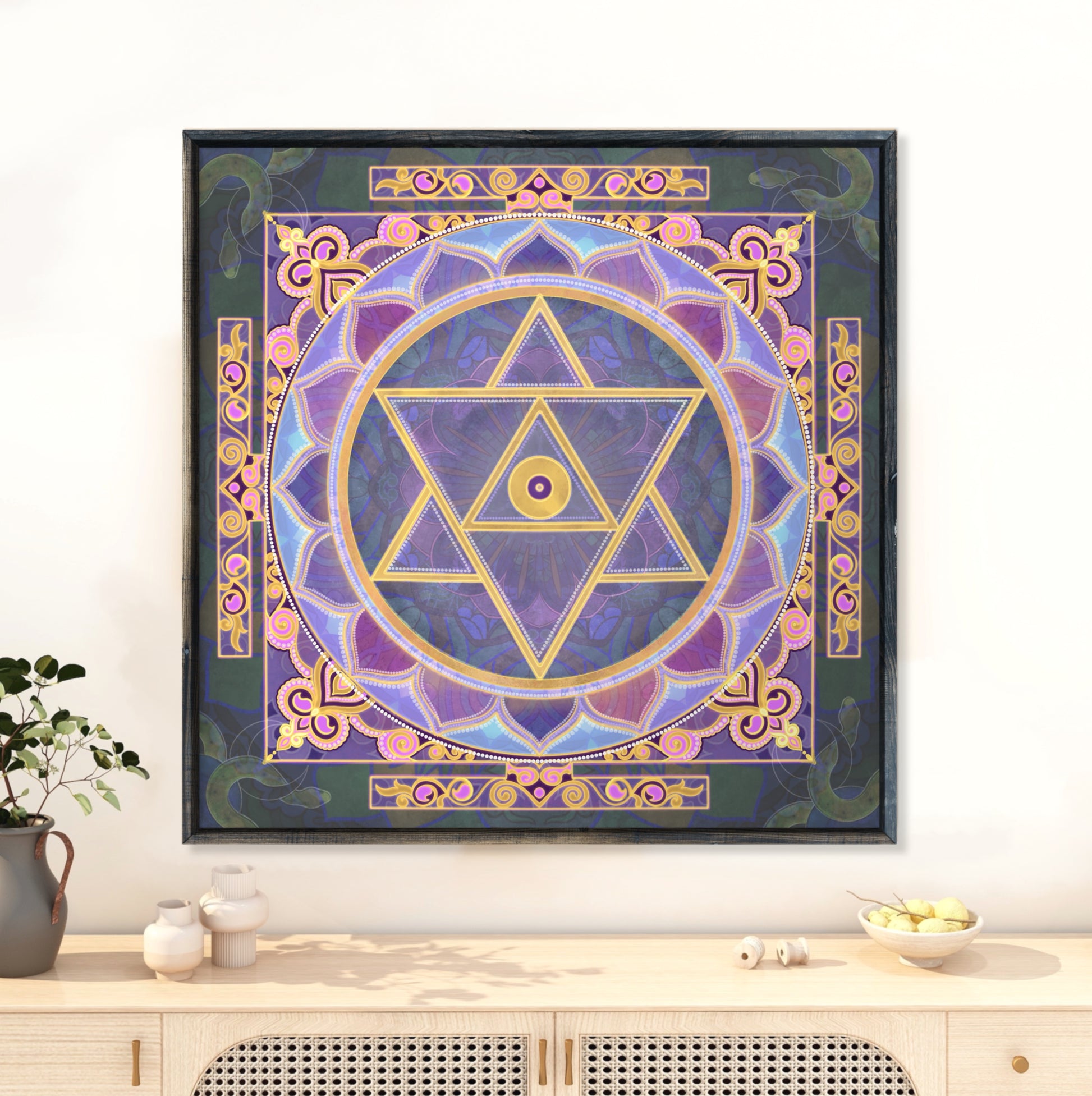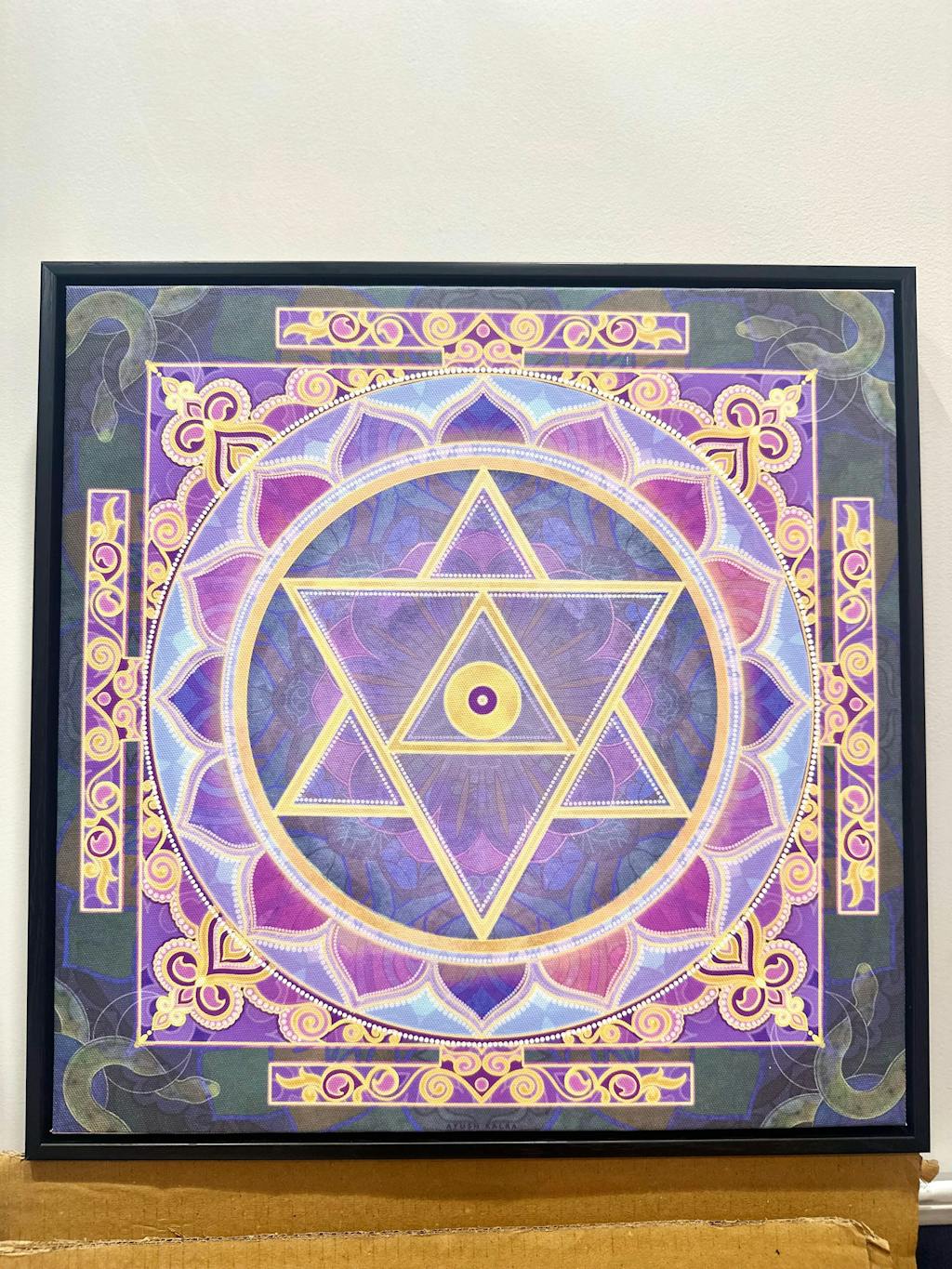 Shiv Yantra- A powerful sacred geometry aligned to Shiva consciousness. The intricate yantra draws awareness inward, representing cosmic balance, creation and spiritual order. Designed to harmonize your space, it invites clarity, focus and meditative alignment.