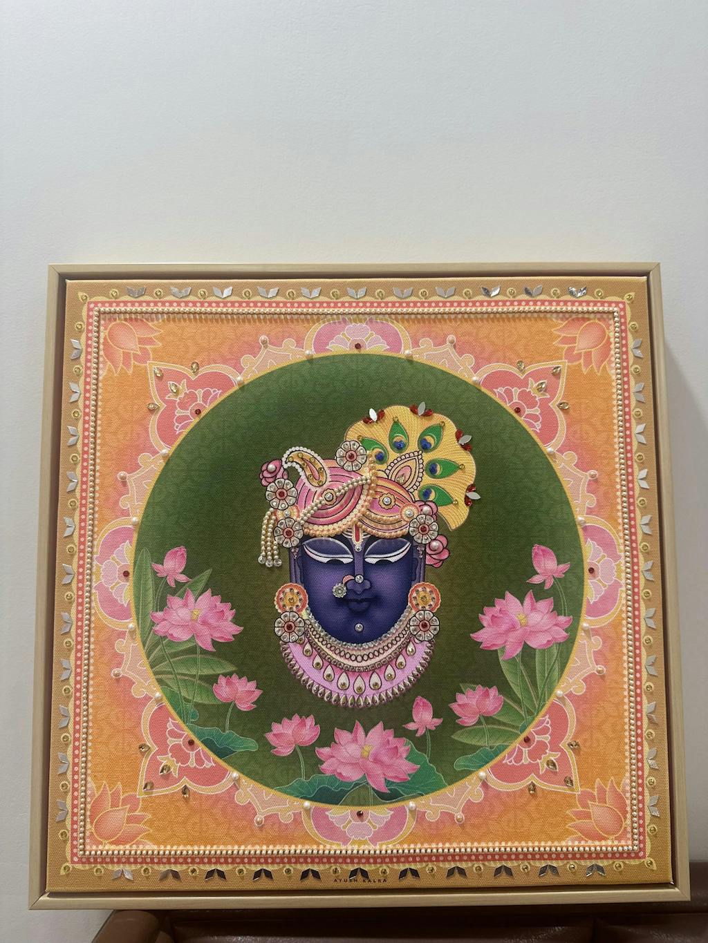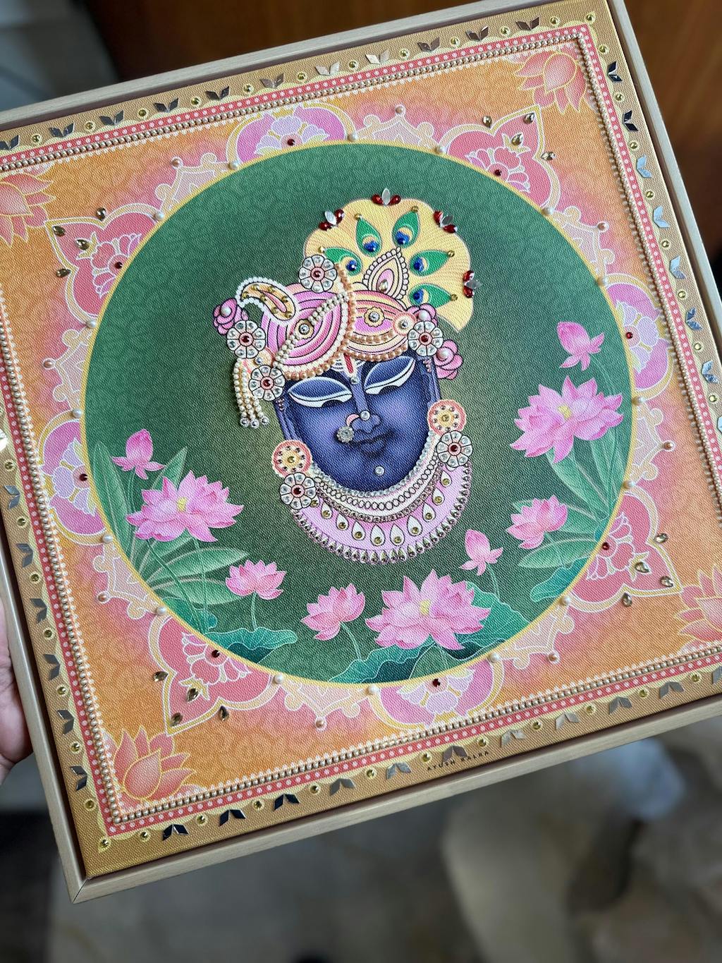 A timeless tribute to devotion, this embossed stone artwork of Shri Nath Ji is crafted with intricate detailing and adorned with an array of hand-selected stones. Each element adds depth, texture, and divine aura bringing sacred presence and serenity into any space. Ideal for spiritual corners, art lovers, and collectors, this piece blends tradition with elegance, making it a soulful addition to your home or gifting collection.