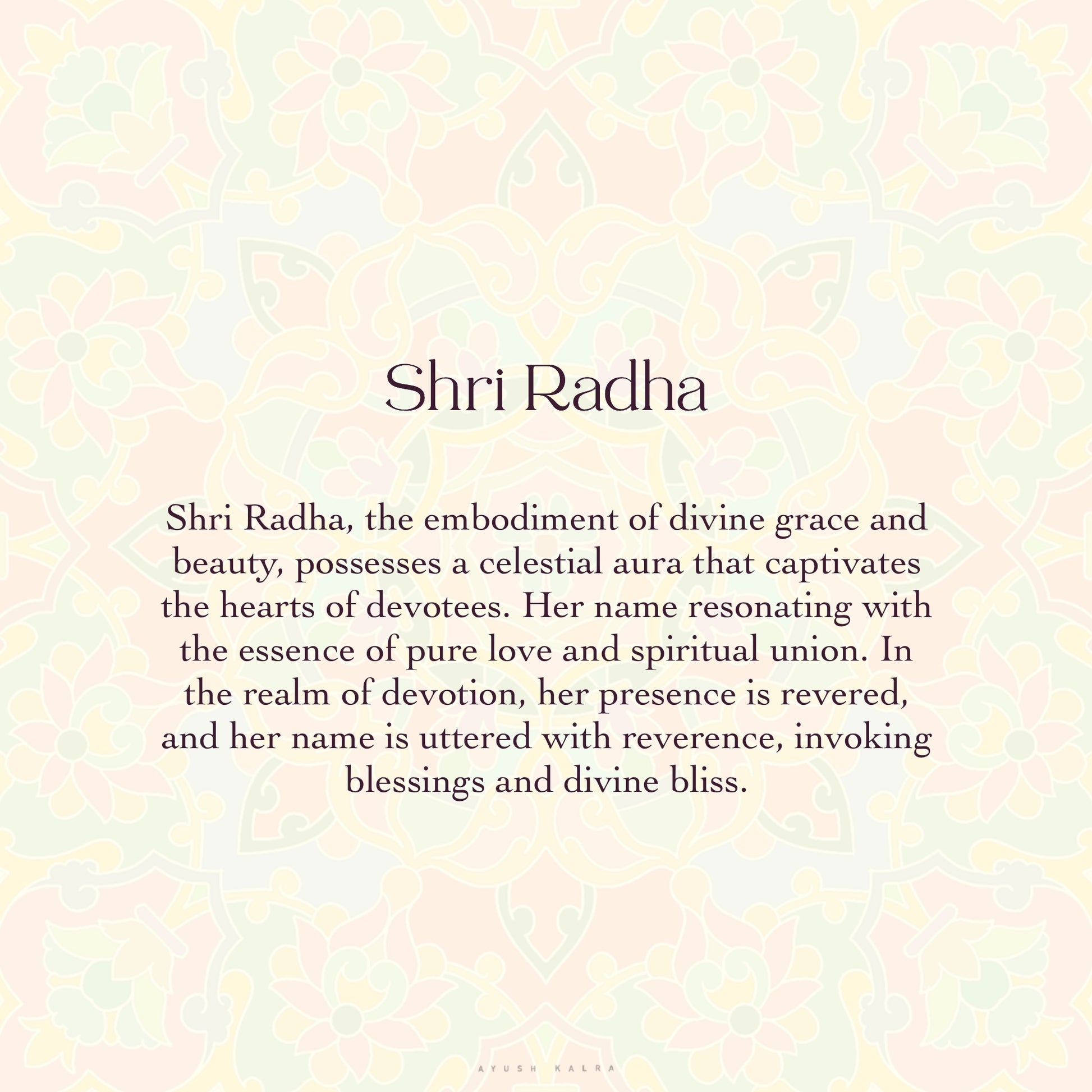 The name "Radha" holds immense significance in the realm of divine devotion. It is a name that resonates with love, purity, and devotion. Uttering the name "Radha" is believed to invoke a connection with the divine, filling the heart with love and devotion. It is a name that carries the power to transport one's consciousness to the realm of transcendence, where the soul merges with the divine in a dance of eternal love.