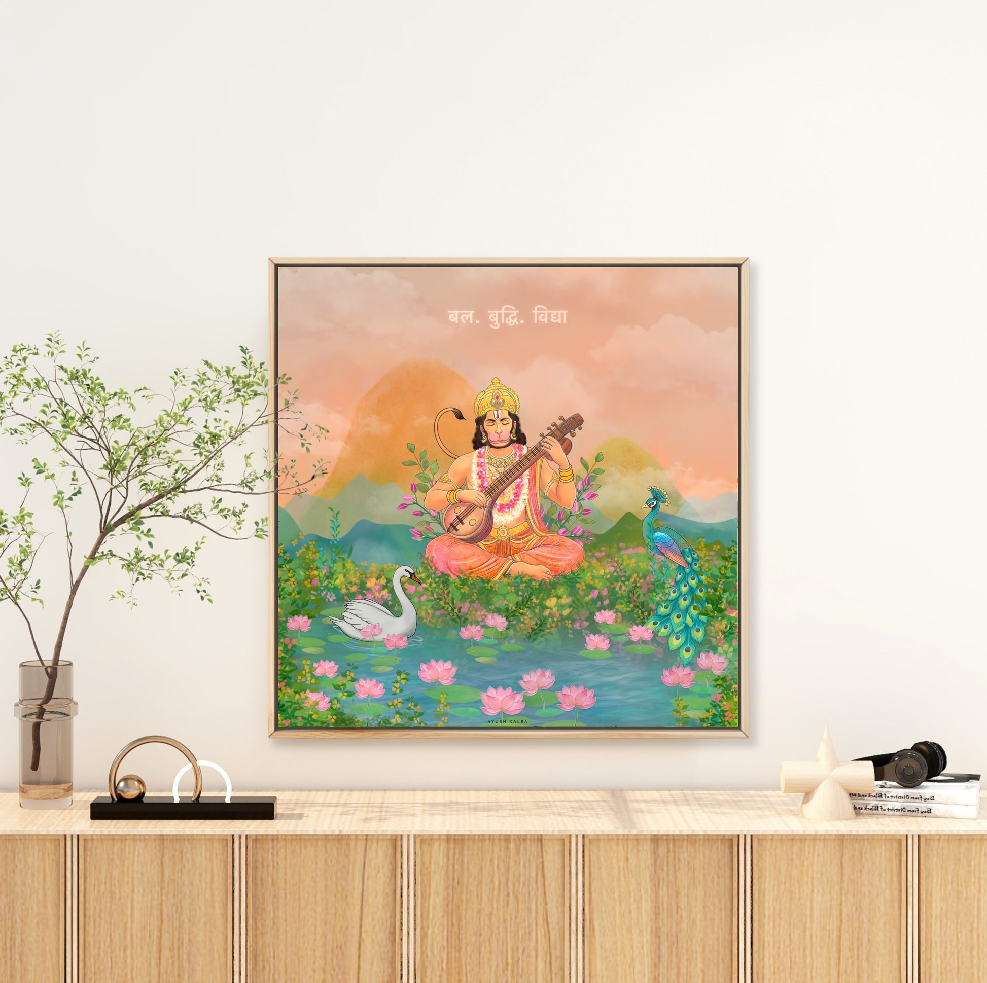 An empowering artwork of Hanuman Ji with the sacred words “Bal Buddhi Vidya” inscribed above. It symbolizes strength, wisdom, devotion, and the removal of all obstacles.